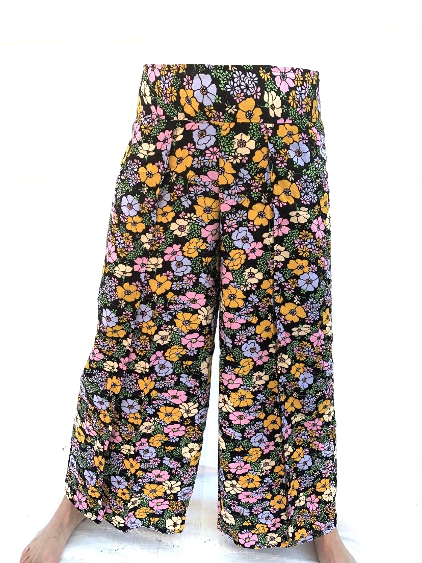 Tenké viskózové plátno je vzdušné a príjemné. Dĺžka nohavíc je 90 cm, patent je elastický a univerzálny, max obvod 96cm. Prať v 40st vode.